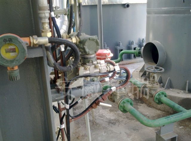 壓力變送器液位計常應氣候溫度過低,造成堵塞現象,需要電伴熱防凍,渝豐化工要求其冬季維持溫度為5--10,并且要求電伴熱帶具有防爆防腐功能。安徽環瑞提供ZRDHR-PF46滿足客戶對使用場合及維持溫度要求,其最高表面溫度為70℃,耐溫可達200℃。可保證維持溫度的情況下,不會出現溫度過高的情況,更加經濟安全,而針對現場細長狹窄的地方自限溫電熱帶可實現交叉纏繞,解決局部伴熱的問題。以下為現場施工安裝圖: