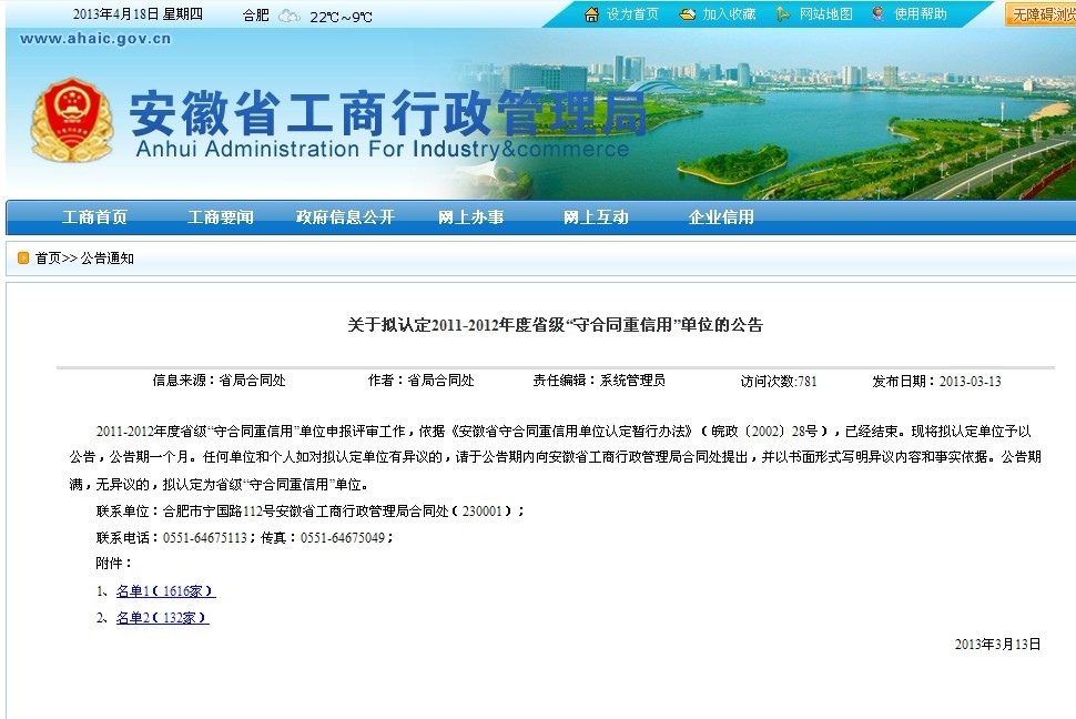 “守合同重信用”企業認定工作通過企業申報,省市、區工商行政管理部門考核驗收、社會公示、征求有關部門意見等環節,充分體現了“自愿、公開、公平、公正”的原則,并最終獲市政府批準。