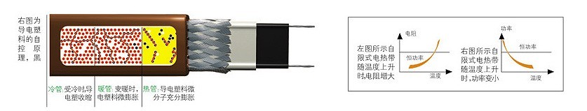 當周圍溫度變冷時,塑料又回復到微分子收縮狀態,碳粒相應連接起來形成電路,伴熱線發熱功率又上升。