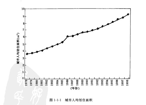 我國地域廣闊.人口眾多.房屋建筑規模巨大。其中住宅建設約占居住建筑的92%.而住宅,是世界各國都面臨的社會問題。“人人享有適當的住房”已成為聯合國第二次人居大會所提出的戰略目標。改革開放以來.從1979年到1998年底.我國城鄉新建住宅建筑面積158億 ㎡其中城鎮住宅宅 約35億 ㎡.農村作宅約123億MI.全國城市人均居住面積從3. 6 ㎡增加到9.3 ㎡(圖一1一1).竣 工面積從3 752萬 ㎡增加到47 600萬 ㎡(圖1-1-2).城鎮住宅建設投資從39.21億元增加到4 310.81億元(圖1-1 3). 1.7億戶遷入新居."八五"期間共完成城市住宅建設投資8 543億元.竣工 住宅10.5億 ㎡,僅1995年住宅竣工面積3.3億 ㎡.比“七五”期間增長76%.九五.期間計劃建設 住宅12億 ㎡,比“八五”期間增長14.3%.到1999年底。我國設城市加為668個.當年全國城市新 建房屋竣工面積4.362 5億㎡.其中住宅2.971 6億㎡.當年底.全國住宅總使用面積為30.505 2億 ㎡.總居住面積為21.011 2億㎡.人均使用面積達到14.2 ㎡.人均居住面積達到9. 8 ㎡分別比上 年增長0.6和0. 5 ㎡.居民生活條件大有改善。住宅建設量大面廣.至今仍呈上升趨勢.而且這個 上升趨勢還將持續20-30年。由此看出,我國住宅建設正處于快速發展階段.不僅是中國歷史上的 最高峰.也是世界上任何一個國家所不可比擬的。