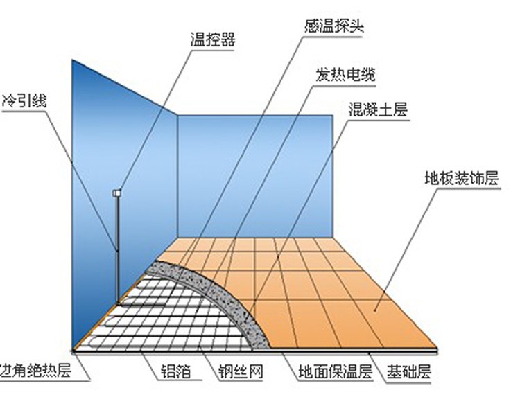 發(fā)熱電纜采暖系統(tǒng)由發(fā)熱電纜和溫控器兩部分組成,發(fā)熱電纜鋪設(shè)于地面中,溫控器安裝于墻面上。當(dāng)室內(nèi)環(huán)境溫度或地面溫度低于溫控器設(shè)定的溫度時,溫控器接通電源,發(fā)熱電纜通電后開始發(fā)熱升溫,發(fā)出的熱量被覆蓋著的水泥層吸收,然后均勻地加熱室內(nèi)空氣,還有一部分熱量以遠紅外輻射的方式直接釋放到室內(nèi)。該種方式的采暖系統(tǒng)把整個地面作為散熱器,室內(nèi)溫度上層低而下層高,有溫足而頂涼的感受,使您感到舒適而自然。