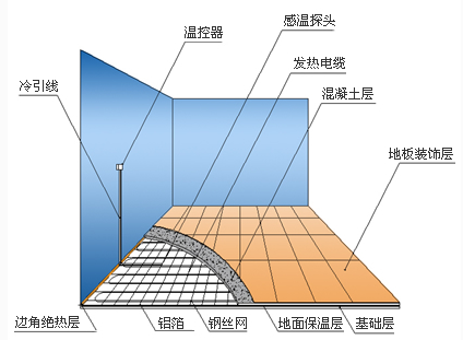 通過鋪設于地板上的地溫探頭或溫控器內(nèi)的室溫探頭,由房間溫控器控制溫度。當室內(nèi)溫度達到設定值后,溫控 器開始動作,斷開發(fā)熱電纜的電源,發(fā)熱電纜停止加熱,當室內(nèi)溫度低于溫控器設定值時,溫控器又開始啟動, 接通發(fā)熱電纜的電源,發(fā)熱電纜開始加熱,這樣往復運行。